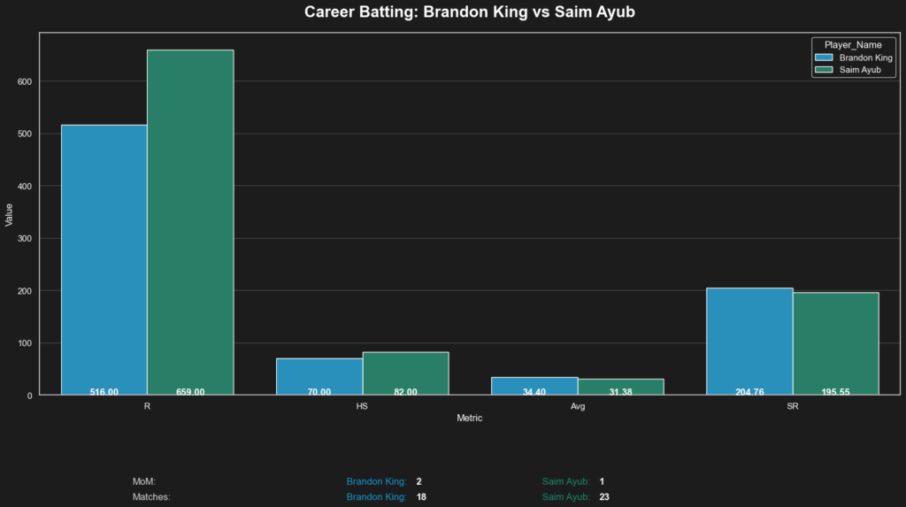 - Higher Strike Rate: King is also scoring faster, boasting a blistering strike rate of 204.76, edging out Ayub’s impressive 195.55.