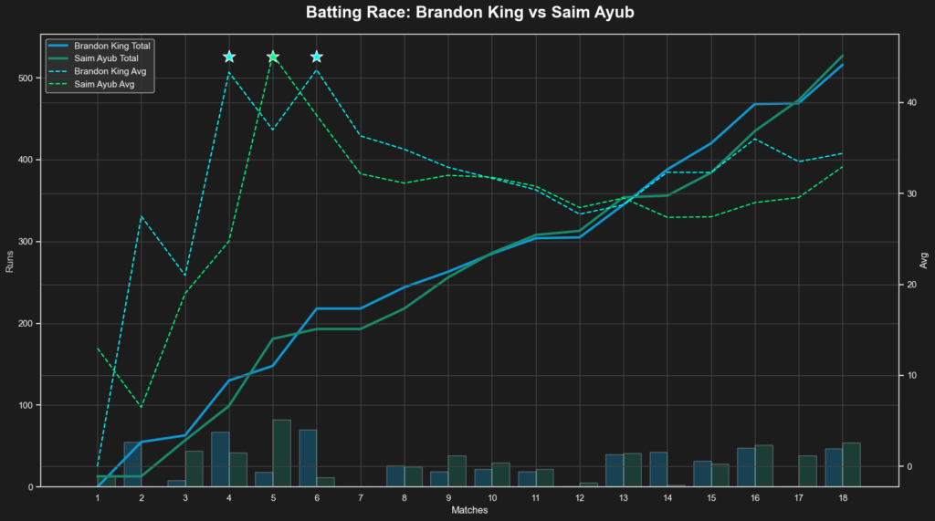 The Trajectory to No. 1 The “Batting Race” graph confirms King‘s dangerous ascent. His blue trajectory line is rising at a steeper angle than Ayub‘s green line, indicating a faster rate of run accumulation. Furthermore, King‘s average curve (dashed blue line) has consistently stayed above Ayub’s in the recent phase of their careers.