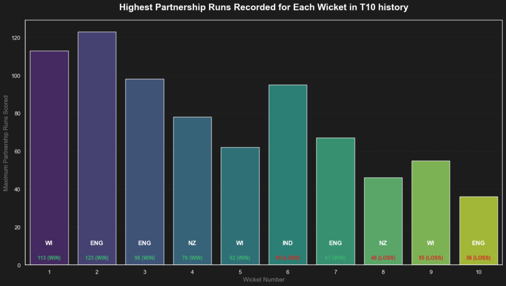 A review of T10 history’s highest partnership runs per wicket reveals a powerful dominance by the West Indies (WI) and England (ENG).