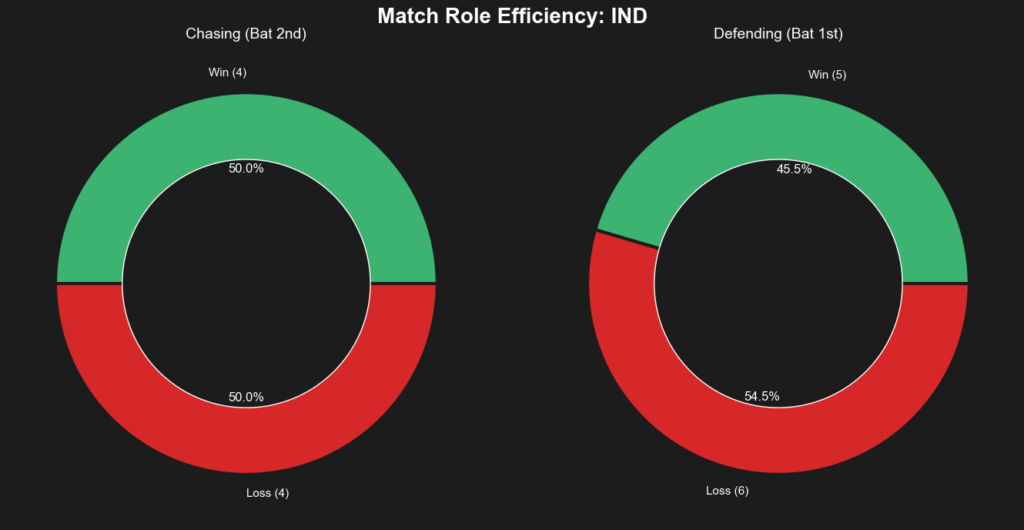 - India: The Men in Blue are far more balanced. They hold a 50.0% win rate while chasing and a comparable 45.5% win rate while defending, making them dangerous in any scenario.