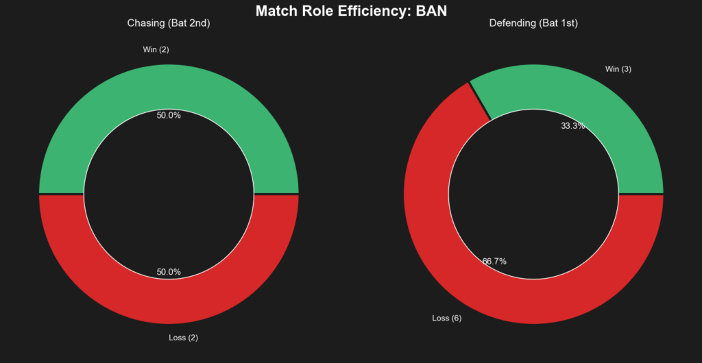 - Bangladesh: They struggle significantly when asked to set a target, winning only 33.3% of matches when batting first (defending) compared to a 50.0% win rate when chasing.