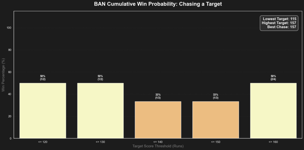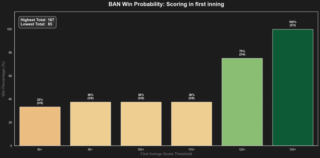 - For Bangladesh (Batting First): 130 is the safety line. When Bangladesh scores 130 or more, their win probability skyrockets to 100% (3/3 matches). Below that threshold, their chances drop drastically (e.g., 38% at 90+ runs).