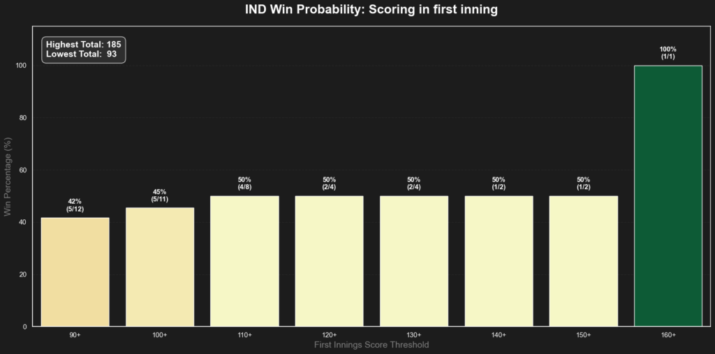 - If India bats first: They are safer. While 160+ guarantees a win (100%), they maintain a competitive ~50% win rate even with scores as low as 110.