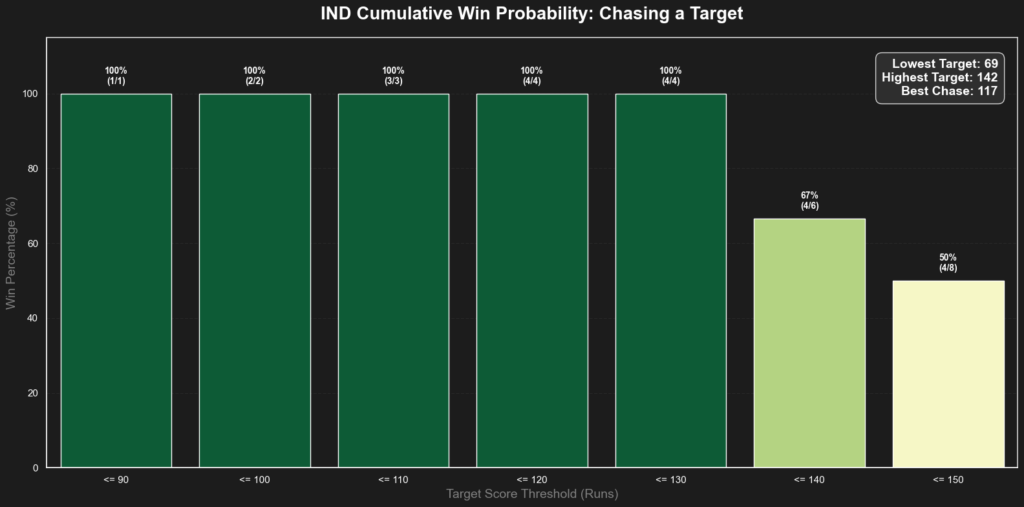 - For India (Chasing): Here lies the conflict. India is clinically efficient at chasing low totals. If the target is 130 or lower, India has a 100% win rate. They only start showing vulnerability when the target creeps toward 140 (win rate drops to 67%).