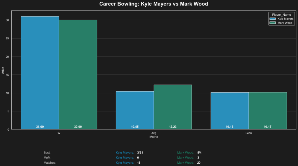 - The “MoM” Dilemma: However, the data highlights a crucial distinction in impact. Despite having worse overall stats, Mark Wood has secured 3 Man of the Match (MoM) awards, while Mayers has 0.