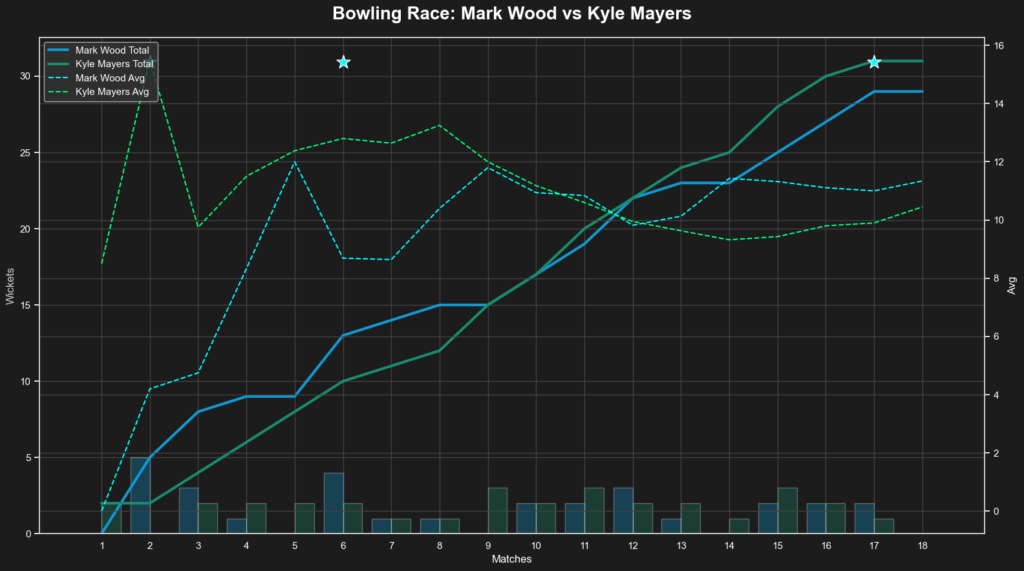 - The Crossover: Around the 11th match mark, Mayersβ wicket trajectory (Green Line) surges upwards, crossing Woodβs (Blue Line) and maintaining that lead till the end.