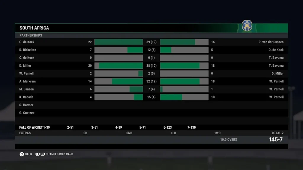 South Africa Innings (145 runs for 7 wickets in 10.0 overs)