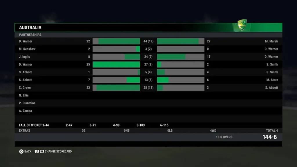 Australia Innings (144 runs for 6 wickets in 10.0 overs)