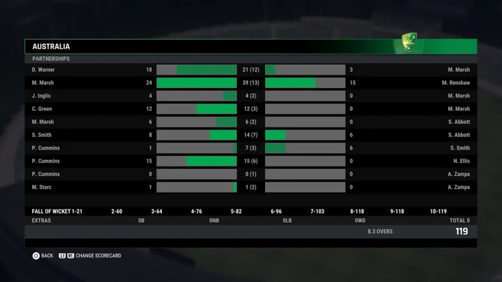 Australia Innings (119 runs for 10 wickets in 8.3 overs)