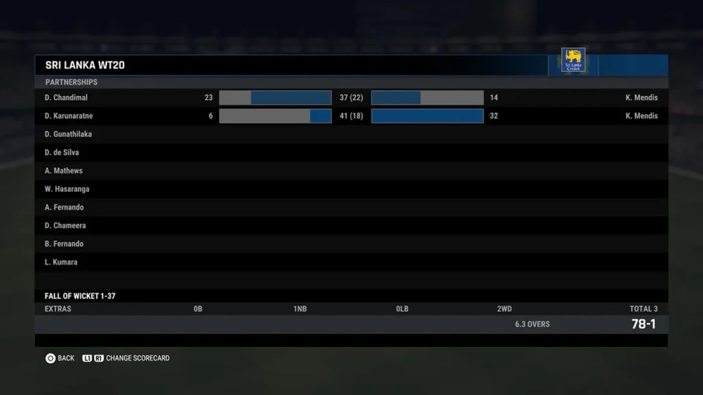 Sri Lanka Innings (78 runs for 1 wickets in 6.3 overs)