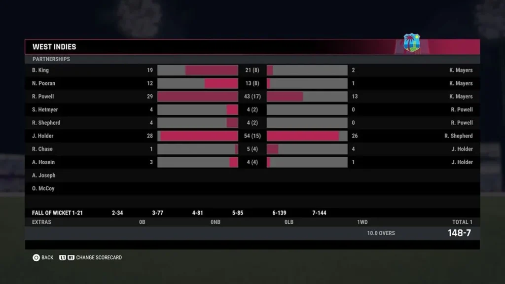 West Indies Innings (148 runs for 7 wickets in 10.0 overs)