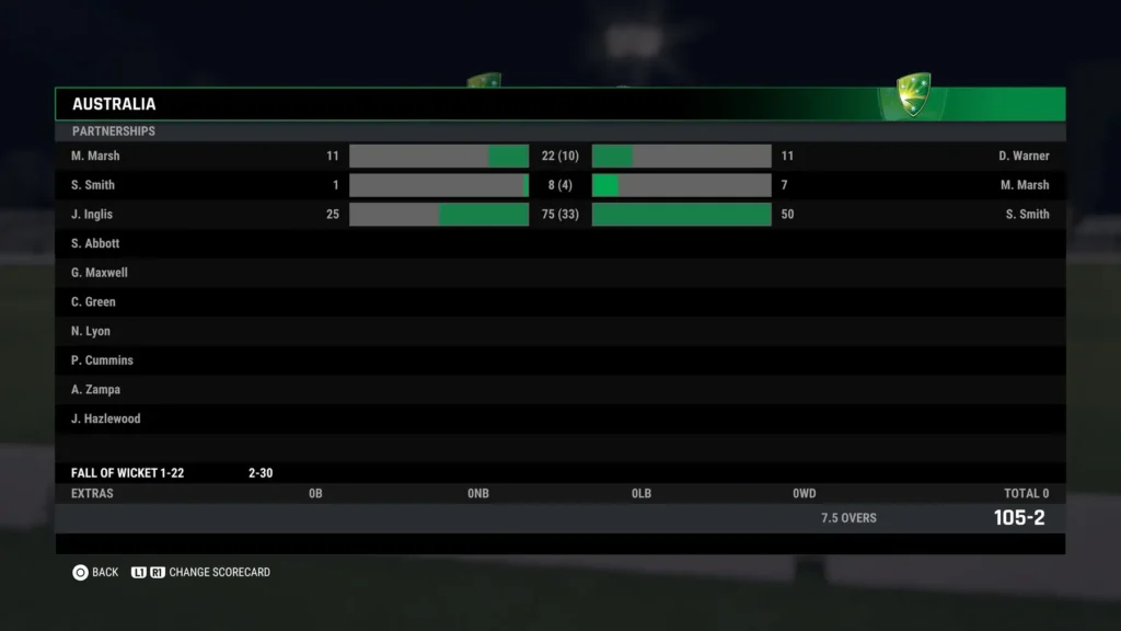 Did not Bat: Sean Abbott, Glenn Maxwell, Cameron Green, Nathan Lyon, Pat Cummins, Adam Zampa, Josh Hazlewood