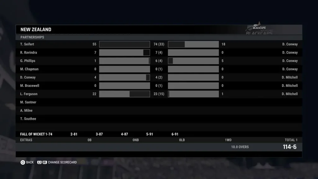 New Zealand Innings (114 runs for 6 wickets in 10.0 overs)