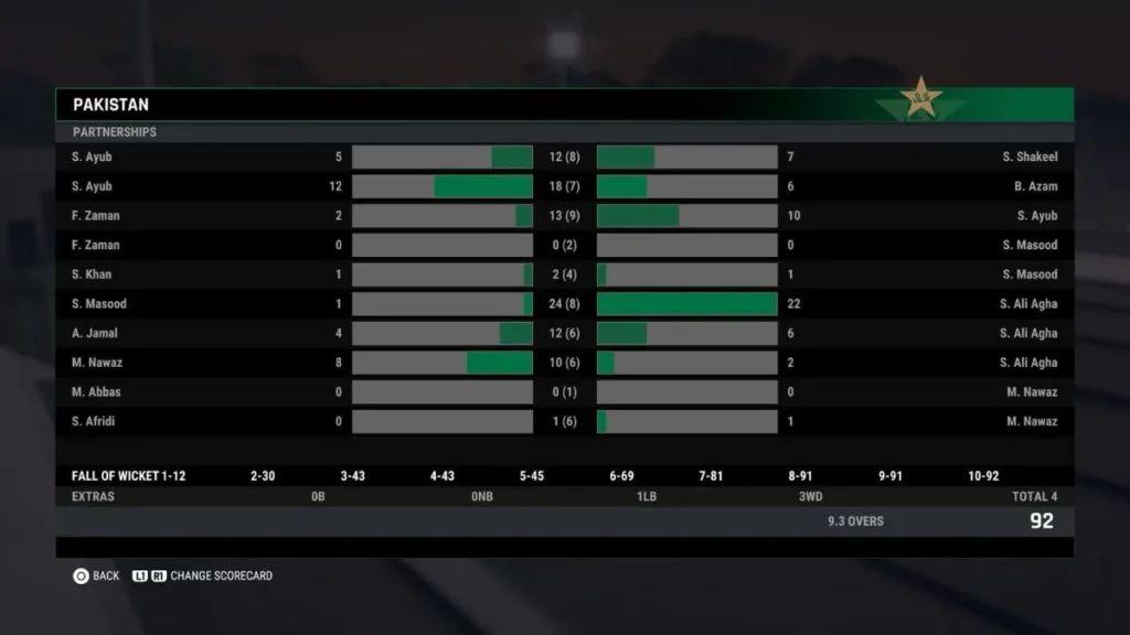 Pakistan Innings (92 runs for 10 wickets in 9.3 overs)