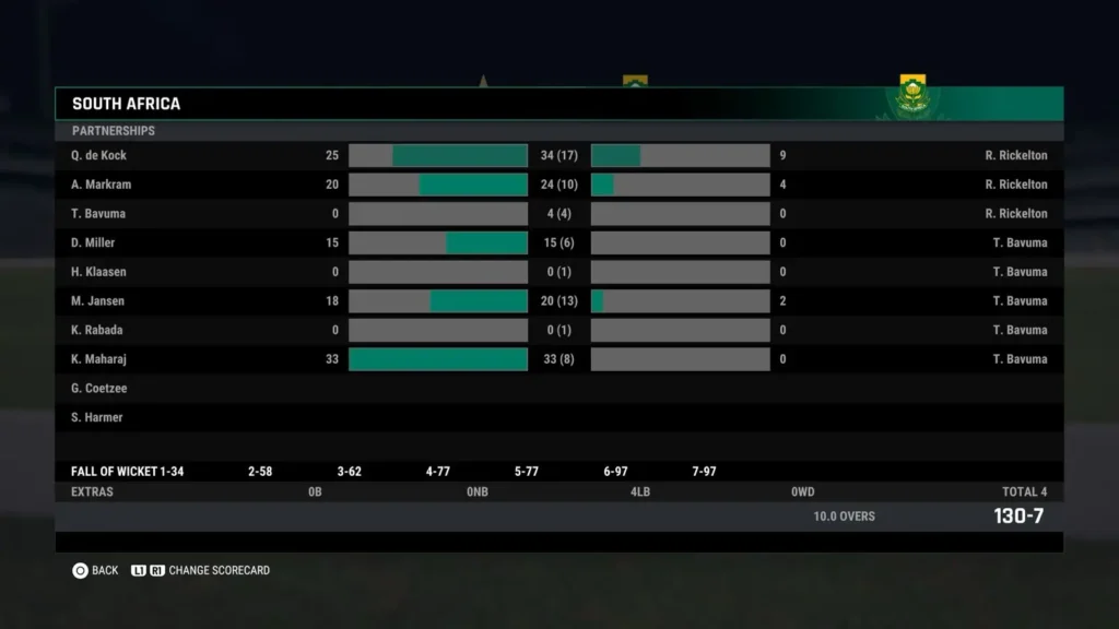 South Africa Innings (130 runs for 7 wickets in 10.0 overs)