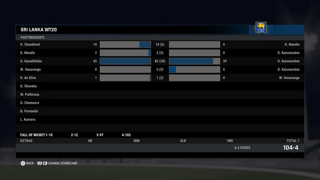 Sri Lanka Innings (104 runs for 4 wickets in 8.4 overs)
