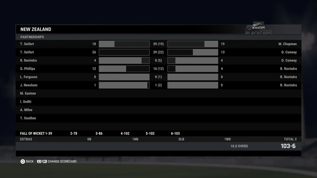 New Zealand Innings (103 runs for 6 wickets in 10.0 overs)