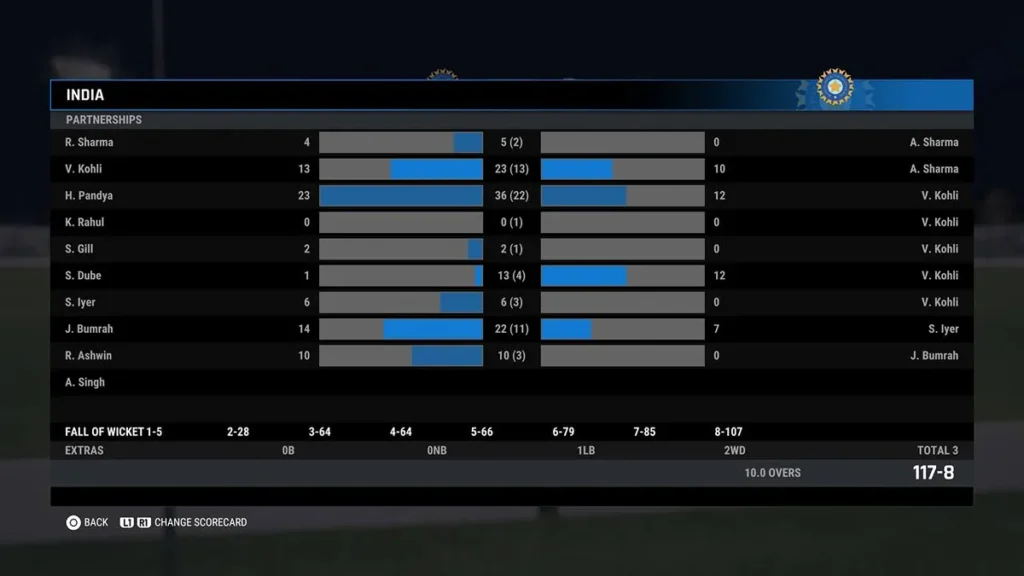 India Innings (117 runs for 8 wickets in 10.0 overs)