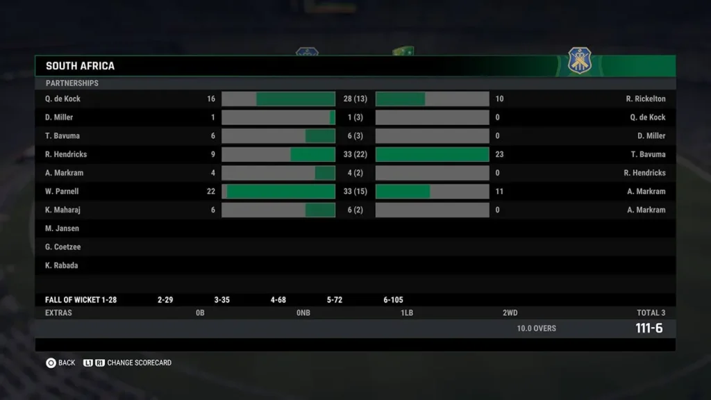 South Africa Innings (111 runs for 6 wickets in 10.0 overs)