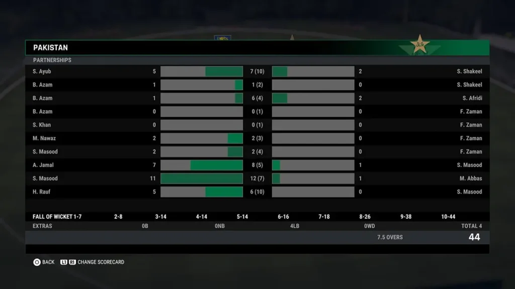 Pakistan Innings (44 runs for 10 wickets in 7.5 overs)