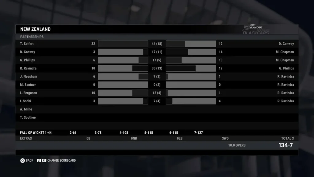 New Zealand Innings (134 runs for 7 wickets in 10.0 overs)